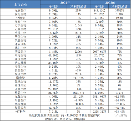 抗原检测试剂,开启了九安医疗的“暴富之路”:2021年四季度,公司实现净利润8.59亿元,同比增长811.15%,占全年业绩比重达94.5%。2022年一季度净利润达143.12亿元,同比激增375倍。这一盈利增速,在A股4000多家上市公司中排名第一。