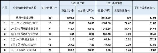乘联会数据显示,2021年有销量的企业是86家。其中,有29家企业的销量少于1万辆,这些企业的产能占了总数的13%,而销量只占总数的0.46%,平均产能利用率只有2.02%。显然这些企业存在严重的“产能过剩”,也将成为产能重置的主要对象。