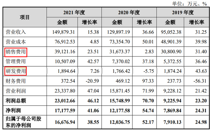 而销售费用分别为3.08亿元、3.17亿元、3.91亿元,一路增长,且常年保持在营收的25%以上,3年累计销售费用超过10亿之巨,是期间累计净利润的近3倍。