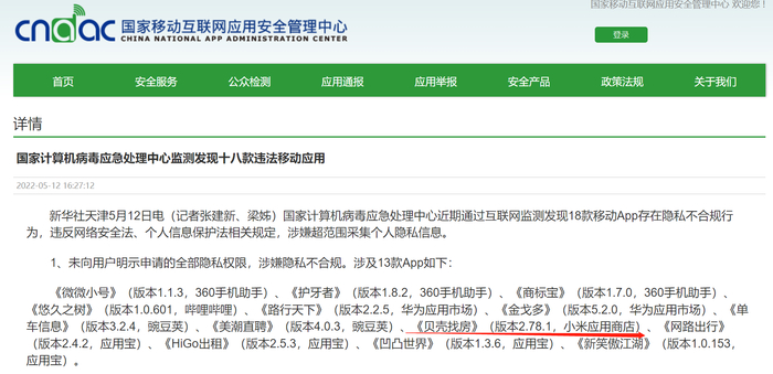 未来网北京5月12日电(记者 谢青)今日,国家计算机病毒应急处理中心公布18款存在隐私不合规行为的移动App,未来网记者注意到,贝壳找房APP因“未向用户明示申请的全部隐私权限,涉嫌隐私不合规”被点名。