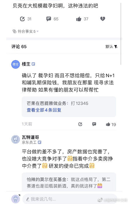 另有贝壳员工爆料称,此次裁员名单中也包括孕妇,并且只给N+1和哺乳期保险钱。对此,未来网记者为向贝壳找房求证,向其官网公示的邮箱发送采访邮件,截至记者发稿时,尚未得到回应。