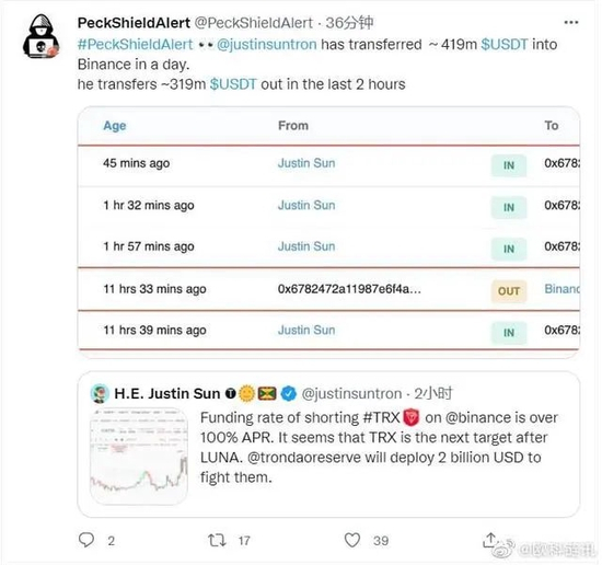 除了赵长鹏,币圈华人富豪中损失惨重的还有孙宇晨,虚拟币安全企业派盾最近在推特上曝光了孙宇晨的交易记录,记录显示波场TRON创始人Justin Sun(孙宇晨)单日将4.19亿枚USDT转入Binance,过去2小时内又从Binance转出3.19亿枚USDT,意味着他一天内亏损了一亿美元。