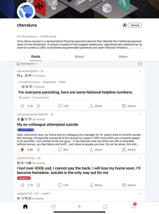 虚拟货币崩盘,赚钱的人总是少数,大部分人都逃不掉被爆仓的命运,甚至走向血本无归的下场。在国外社交平台Reddit上,出现了不少标题为“企图自杀”的帖子,其中有人称自己已经损失超过45万美元(约合人民币305万元),“自杀是唯一的出路”。