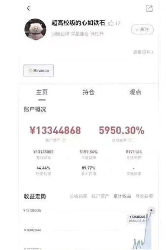 也有人在这一波暴跌中通过做空赚到了钱。网上流传一张收益截图显示,一位用户名为“超高校级的心如铁石”的币安用户收益率为5950%,其总收益为1313.5万元。按5950%的收益率算,该用户本金只有22万元。