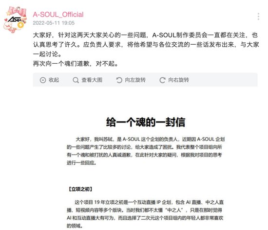 最新消息,A-SOUL的企划负责人苏轼发表《给一个魂的一封信》进行了回应: