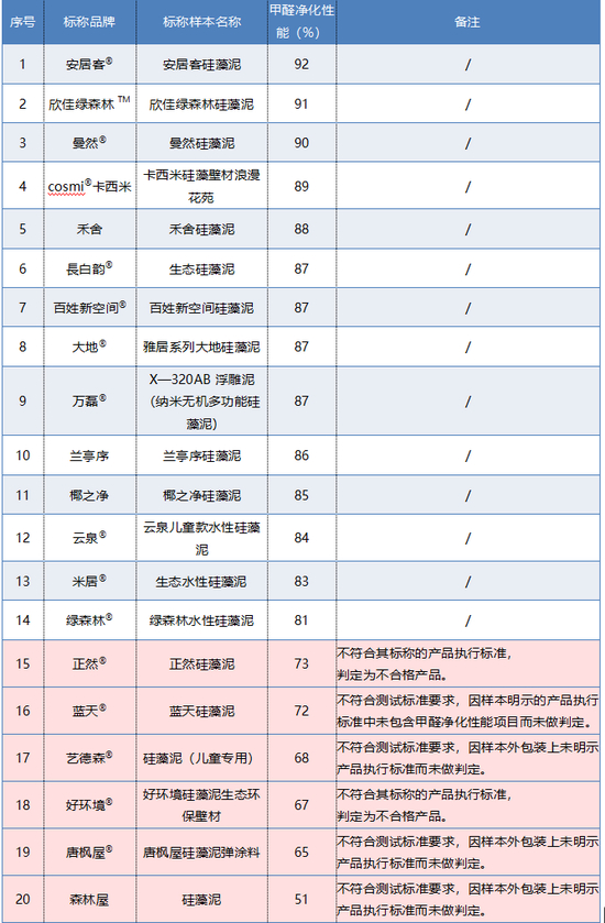 5月9日,重庆市消费者权益保护委员会公布20款硅藻泥比较试验结果,其中好环境、正然两款样本在游离甲醛、甲醛净化性能两项指标中不符合其明示的产品执行标准。另外,蓝天、艺德森、唐枫屋、森林屋在甲醛净化性能项目测试中,不符合测试标准要求,但因样本外包装未明示产品执行标准而未作判定。