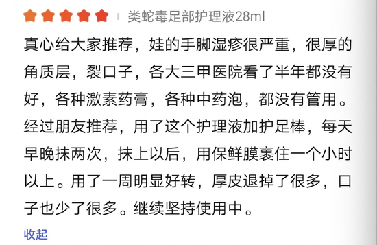 需要指出的是,在产品评价方面,部分所谓“买家”大赞产品“疗效”——“止痒效果不错,奈何脚疾严重,还是会痒,需要多用”“各大三甲医院都没治好的手脚湿疹,用着之后明显好转”“这个药解决了脚部问题”……显然在“带节奏”误导消费者认为此产品为药品。