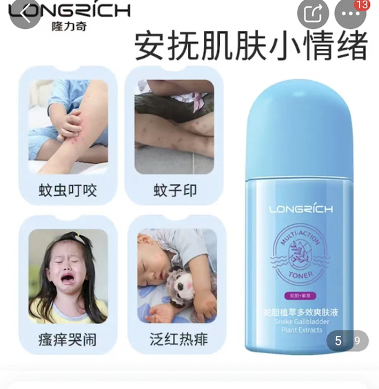 “隆力奇蛇胆植萃多效爽肤液”则在宣传页面标注“适合6个月以上宝贝”并配有婴幼儿图片,宣传页面中,大肆宣传“止痒”“一瓶多效”“泛红热痱”“速解蚊虫叮咬的急痒”等功效。