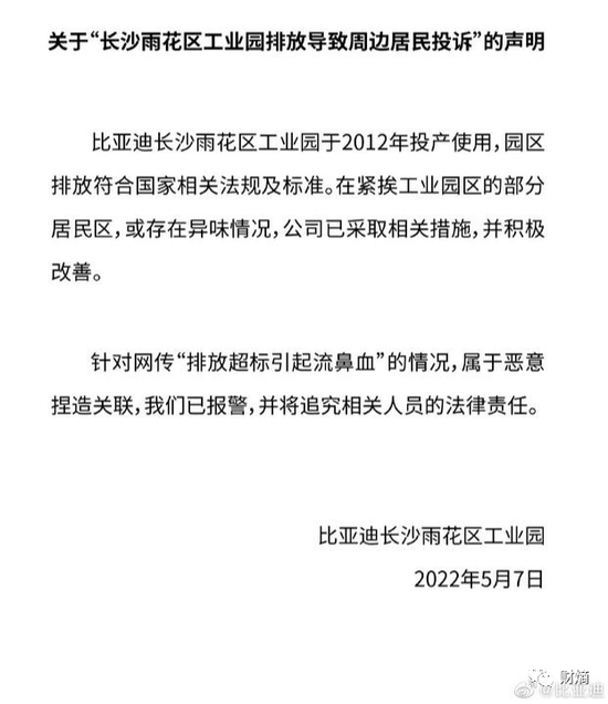 面对舆论压力,5月7日长沙比亚迪表示:园区排放符合国家相关法规及标准,针对网传“排放超标引起流鼻血”的情况,属于恶意捏造关联,公司已报警,并将追究相关人员的法律责任。