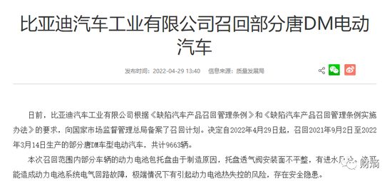 面对多起自燃事故,比亚迪向国家市场监督管理总局备案了召回计划,决定自2022年4月29日起,召回2021年9月2日至2022年3月14日生产的部分唐DM车型电动汽车,共计9663辆。