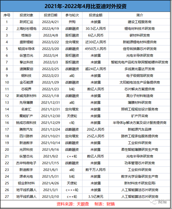 值得一提的是,比亚迪38家对外投资中,在2021年至2022年4月的不到一年半时间,就高达27家,占公司多年投资总数超七成。