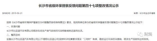 2019年6月,长沙市生态环境局官网上公布的《长沙市省级环保督察反馈问题第四十七项整改情况公示》显示,长沙比亚迪因喷涂车间生产废气排放的污染物影响附近居民,作为重点投诉企业,长沙比亚迪被纳入重点监管对象。
