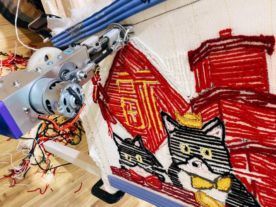 体验织毛毛毯可谓体力活。贝壳财经记者提供了想要创作的图案后,店员用投影仪将图案投在布上,经过黑笔描边,需要自己把各种颜色的毛线放进枪里,用枪将毛线戳进布里作画。