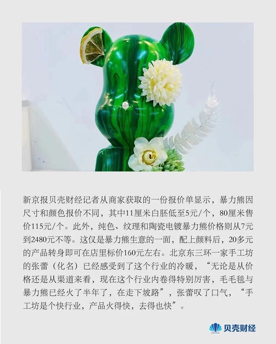 “如果你有自己的新思路,我们可以配合客户共同开发模型”,贝壳财经记者采访的一家工厂销售表示,暴力熊的订单变少了,现在的工厂售价已经比以前下降,而且款式越来越多,市面上还出现了带有托盘的熊,因为具有实用价值,还能再卖一段时间。不过,他们现在也已经在开发新的模型。