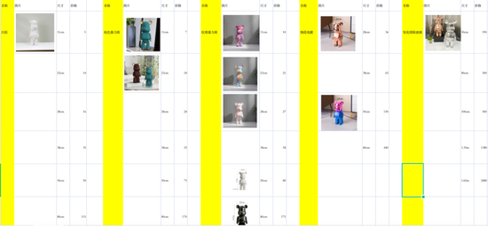 记者获得一份暴力熊报价表显示,白胚分为11厘米、23厘米、28厘米、38厘米、50厘米和80厘米六个尺寸,价格从5元到115元不等。此外,暴力熊还可以选择纯色、纹理、陶瓷和氧化镁贴玻璃,同样因尺寸不同,价格也存在差异。报价表上,最贵的氧化镁贴玻璃暴力熊,1.65米售价2480元。