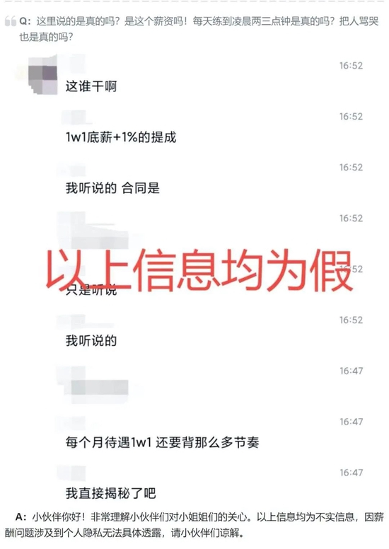 让粉丝感到不满的,还有扮演者们的薪资待遇。一张在粉丝群中广泛流传的截图显示,A-SOUL的5位成员扮演者底薪只有“一万一底薪+1%的提成”;另一个账号则称,A-SOUL的5位成员扮演者每月工资只有七千元。