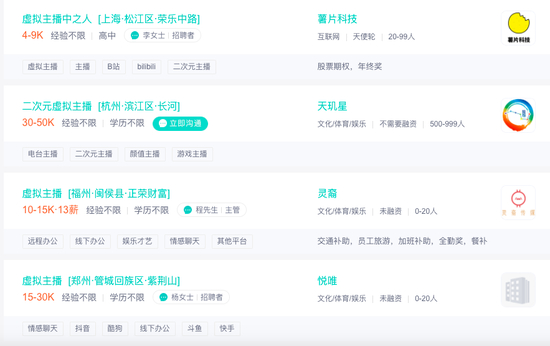 5月16日,红星资本局在Boss直聘平台搜索“虚拟主播”岗位时发现,其薪酬定价大部分在每月4000元到15000元之间。