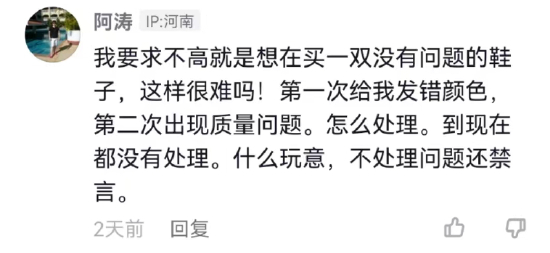抖音上FILA官方发布的刘畊宏广告下面的评论也写到,FILA第一次给其发错颜色,第二次出现质量问题,至今没有处理,不处理问题还禁言。
