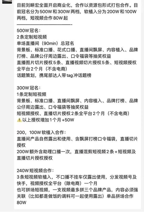 “火了”之后,业内又流传出一份报价单,上面清晰的写着:目前刘畊宏全面开启商业化,目前冠名分为500万和300万两档,软植入分为200万和100万两档,短视频合作80万起。相较于此前翻数倍。