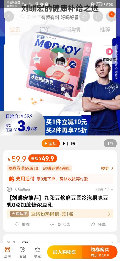 与此同时,店铺内所有“刘畊宏推荐/同款”产品均显示为预售状态,其中一款“刘畊宏推荐九阳豆浆冷泡果味豆乳”荣登天猫豆浆粉热销榜第一名,月售订单数已超4万件。