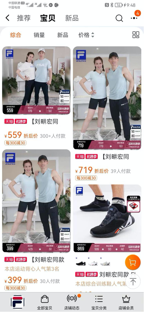 然而,从宣传的效果来看,刘畊宏并未给FILA带来显著的关注度。新浪财经注意到,FILA的抖音旗舰店、淘宝旗舰店、小红书账号上都使用了“刘畊宏同款”字样。抖音的账号更是直接播放了刘畊宏直播“本草纲目”的视频并配文“FILA全天候机能高弹裤高弹面料,任意伸展”等广告字眼。