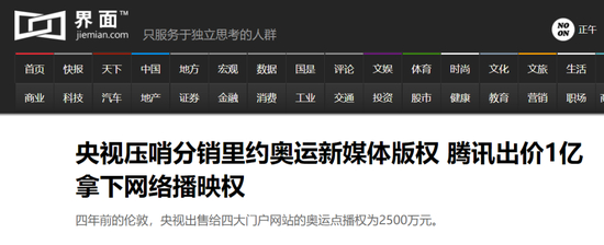 据界面报道,“1亿人民币的报价过于高昂,且不论只有延迟30分钟的点播权,就连如何利用资源、如何进行包装乃至借此进行招商,都因为时间紧迫而问题重重。也正因如此,新浪、搜狐、乐视和网易都稍显犹豫,只有腾讯一路领跑。”