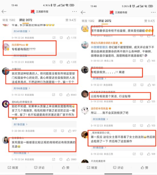 更有消费者则进一步表示,“专柜卖假货,离谱!以后专柜就是个笑话。”