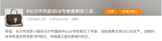 今日,一则#长沙市民起诉LV专柜售假获三倍赔偿并退货#的新闻登上微博热搜,12小时之内阅读量迅速突破1.2亿,当日讨论量达3192人次。