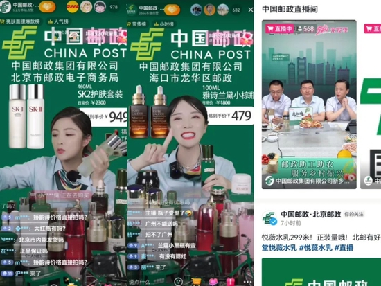 “左上角点关注,备注加急发货”“平时要1300多,今天给大家补贴福利,一瓶正装到手只需要629”。抖音直播间里,中国邮政的各个分公司账号扮演一个个带货达人,用相似的直播话术完成品宣,并引导粉丝下单。
