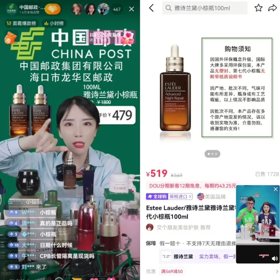 价格甚至比抖音其他主播还要低。例如雅诗兰黛小棕瓶100毫升精华,交个朋友直播间售价519元,而邮政直播间售价479元。一瓶悦木之源菌菇水,交个朋友和其他明星直播间售价88元,而邮政直播间售价82元。