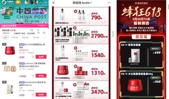 618预售即将到来,从价格来看,邮政直播间里的不少商品,明显低于淘宝头部主播。一款150ml海蓝之谜精萃水,李佳琦直播间618预告1250元加上100ml赠品,邮政直播间卖629元,算下来后者性价比更高。一瓶SK-II大红瓶面霜,蜜蜂惊喜社618预告568元,邮政直播间卖559元。