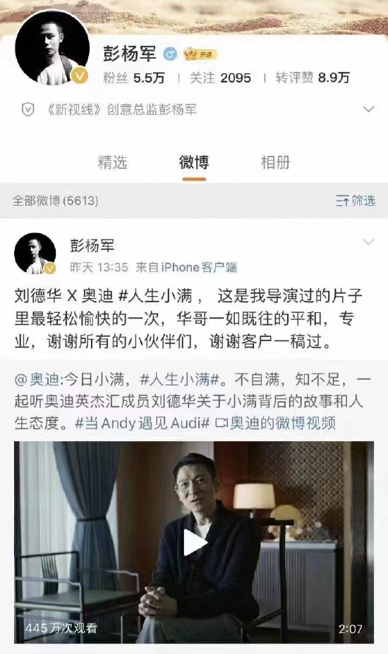 5月21日,奥迪侵权广告导演彭杨军在微博上转发奥迪侵权广告并配文称,“刘德华X奥迪#人生小满,这是我导演过的片子里最轻松愉快的一次,华哥一如既往的平和,专业,谢谢所有的小伙伴们,谢谢客户一稿过。”