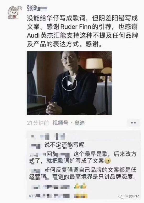 此外,根据三言财经获得的一张疑似文案作者发表的朋友圈截图显示,作者并未提及文案借鉴、引用了他人作品。该作者表示,“没能给华仔写成歌词,但阴差阳错写成了文案”,他还感谢奥迪能支持自己这种不提及任何品牌及产品的表达方式。