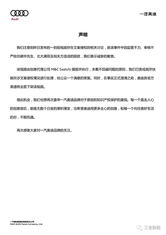 声明称,该事件中,公司监管不力,审核不严,对刘德华以及北大满哥造成困扰。同时,涉事视频由广告公司M&C Saatchi代理,奥迪已要求其对涉嫌抄袭情况进行处理。