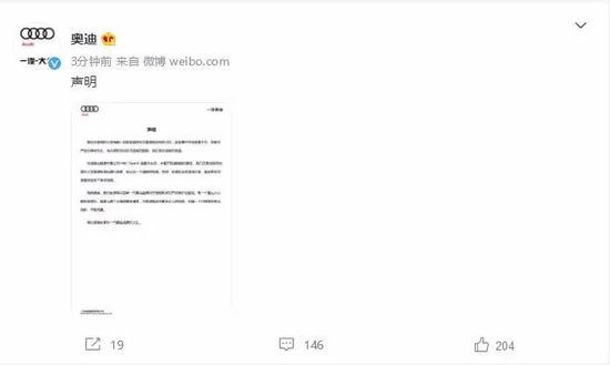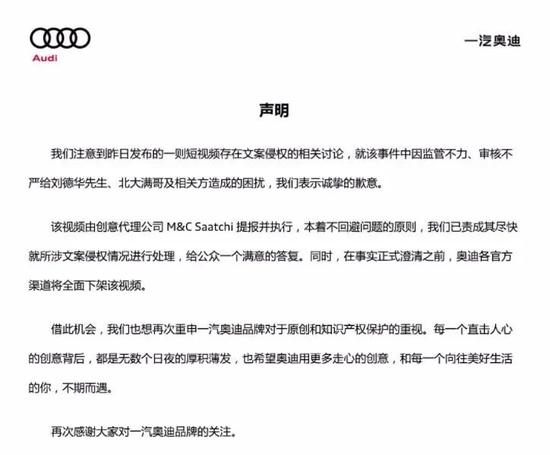 22日上午,奥迪官方微博发布声明,“表示诚挚的歉意”。声明同时称,该视频由创意代理公司提报并执行,奥迪各官方渠道将全面下架该视频。