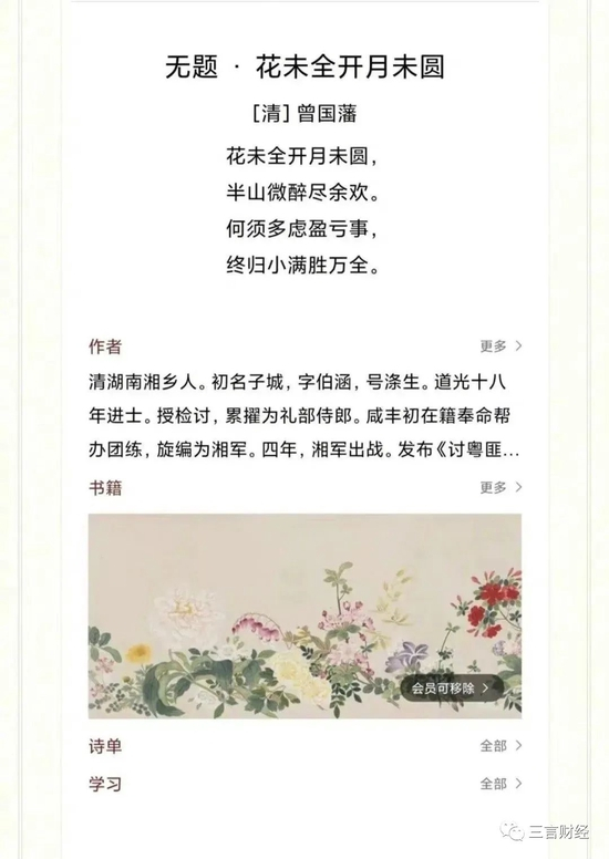 而且这首诗也并非曾国藩作品,只是曾国藩在其家书中引用过诗的第一句“花未全开月未圆”。该诗原作者是北宋名臣蔡襄,诗名为《十三日吉祥探花》。