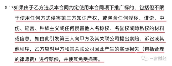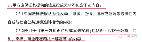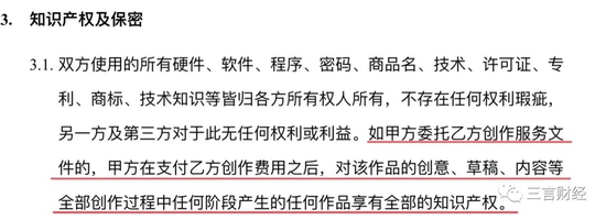 根据对方向三言财经提供的一份品牌方委托广告代理商的合同显示,在双方签订的合同中,确实对知识产权有着严格要求。
