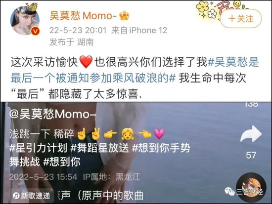 先看吴莫愁,其社交账号与其行踪保持了一致,其账号内容很大可能由其自己发布,有专业团队制作。
