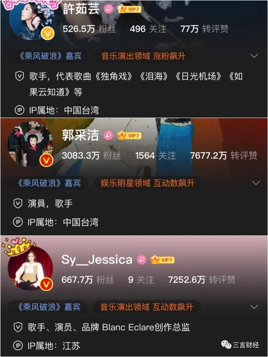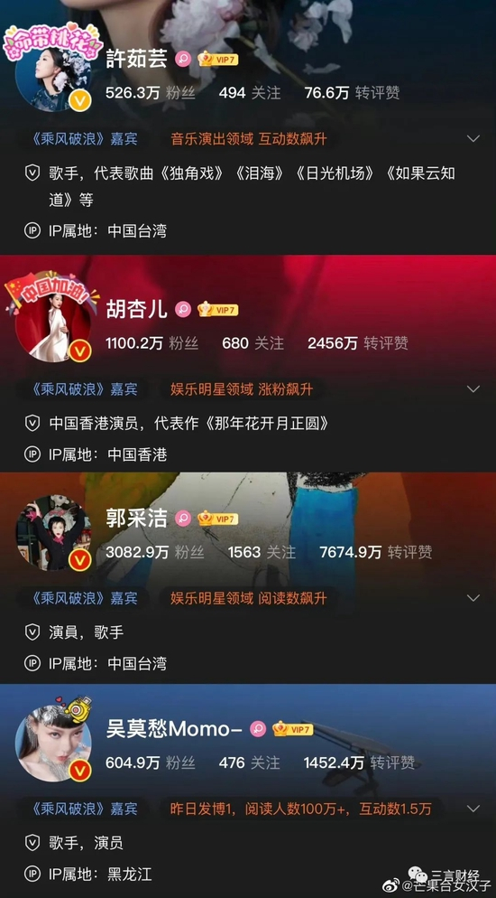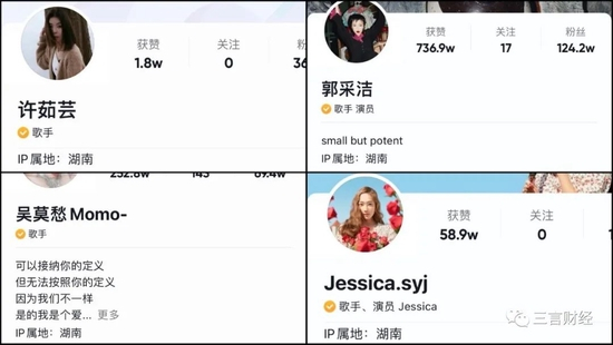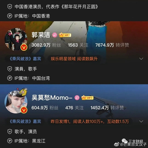 他们发现在节目播出时,浪姐许茹芸、郭采洁的微博IP属地显示在中国台湾,而吴莫愁显示IP属地是黑龙江,胡杏儿显示中国香港。