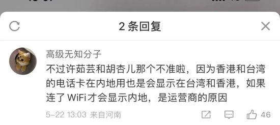 不过对于显示香港、台湾IP属地,网友有这样一种解释:中国香港和中国台湾的电话卡在内地使用会显示原来的IP属地,连接上WiFi就会显示内地的IP属地。