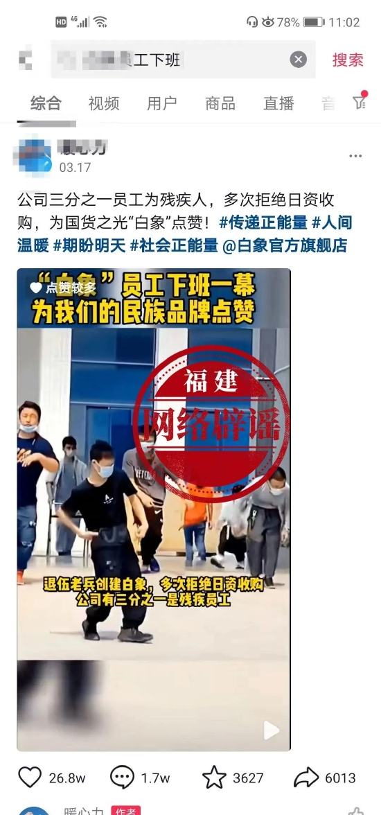 三言财经5月24日消息,昨日,福建辟谣发文称,网上热传的一段声称是白象员工下班的视频一度引发热议。视频内容称白象公司三分之一员工为残疾人,多次拒绝日资收购。