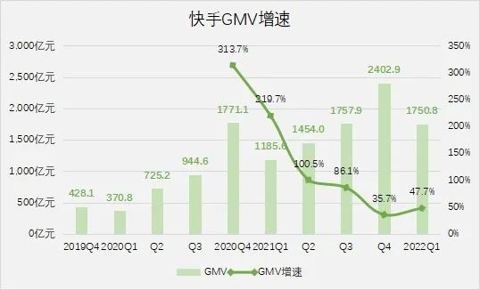 快手电商完成了从0到1的突破,从增速看,即将面临第一个瓶颈。今年一季度,快手GMV达到1750.8亿元,同比增长47.7%,在没有大促的情况下,冲破2000亿元关卡并不容易。
