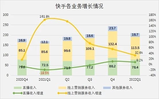 截至一季度,快手在线广告收入113.5亿元,同比增长32.6%,经过数个季度高增长,该业务体量已经成为第一大收入来源。
