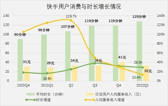 理论上,拓展内容创造了较好的变现环境。这一点从用户人均时长和人均服务消费可以一窥究竟。截至一季度,快手用户平均时长超过120分钟,同比增长25%。人均服务收入没有保持住40元,回落至32.6元,同比增长13.4%,为近几个季度最差水平。