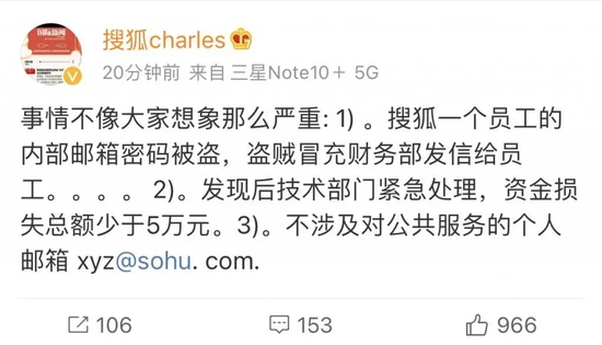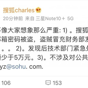5月25日,搜狐公司董事局主席兼CEO张朝阳终于对外回应此事,称“事情不像大家想象那么严重。搜狐一个员工的内部邮箱密码被盗,盗贼冒充财务部发信给员工,发现后技术部门紧急处理,资金损失总额少于5万元。不涉及对公共服务的个人邮箱”。