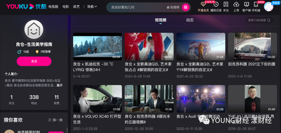 在优酷网站上,“良仓-生活美学指南”账号下,可看到奥迪、别克、凯迪拉克、MINI、奔驰等汽车品牌的视频,标题多以“良仓×品牌”的模式命名。