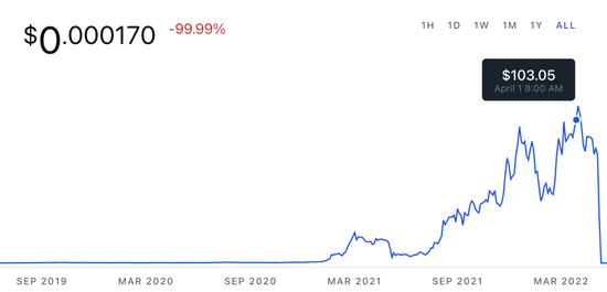 由斯坦福计算机大神 Do Kwon 建立的区块链系统代币LUNA曾在一年多里涨了近200倍,最高的时候一度超过110美元,被中文炒币者简称为‘币圈茅台’。但大厦建得太快,崩塌起来往往更快。5月8日由于短时间内的集中兑换,疯狂的增发直接带崩了LUNA的价格,这一崩盘就是三天内跌走95%,实现了字面意义上的一文不值。