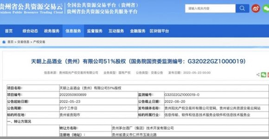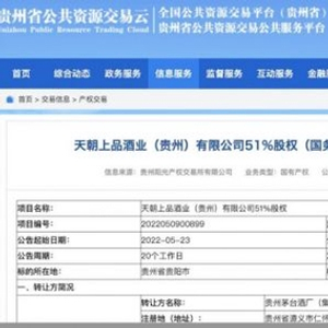 5月25日,《华夏时报》记者查询贵州省公共资源交易云网站发现,贵州茅台酒厂(集团)技术开发有限公司(下称“茅台技开公司”)拟转让天朝上品酒业(贵州)有限公司(下称“天朝上品酒业”)51%股权。若此次转让交易成功,茅台技开公司将完全退出天朝上品酒业。