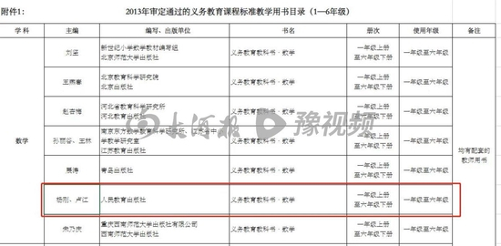 2013年5月6日,教育部办公厅发布《教育部办公厅关于2013年中小学教学用书有关事项的通知》,《通知》称第二批义务教育阶段教材的修订、审定工作已基本完成。在该《通知》的附件中,关于《2013年审定通过的义务教育课程标准教学用书目录(1—6年级)》表格显示,由杨刚、卢江主编,人教社出版的小学数学教材(1—6年级)也在其中。