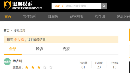 在新浪旗下的消费者服务平台“黑猫投诉”上,记者输入关键词“老乡鸡”后出现约110条搜索结果,其中有81条投诉,不乏消费者投诉老乡鸡“菜品有虫”“食品不卫生不清洗”“服务差”等问题。截至5月29日,该平台显示商家“已回复”23条,投诉“已完成”15条。
